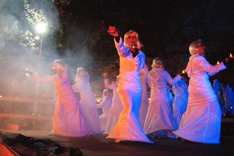 Halloween 2010 hat sich als der Besuchermagnet schlechthin erwiesen. Mit 2400 Gästen am Sonnabend und 1800 Besuchern am Sonntag feierten so viele wie noch nie in dem mit Hunderten Kerzen, Fackeln und Kürbissen geschmückten Tierpark. Gespenster und Skelette grüssten von Imbiss und Gruselpfad, erstmals ruderte der Sensemann auf dem kleinen Schwanenteich. Höhepunkt des zweitägigen Festes war die jeweils zweistündige Show der Eilenburger Tanzgruppen auf der Pferdekoppel. Von 17 bis 19 Uhr lieferten 80 Hexen, Feuerflammen, Wassernixen, Feuerteufel und Fackelträger eine Show der Extraklasse, die viel Anerkennung fand. Die Entscheidung des Tierparkvereins, das Programm erstmals komplett in die Hände eines Eilenburger Vereins zu legen, hat sich damit als richtig erwiesen. Der Tierparkverein, von dem selbst Dutzende Helfer an Knüppelkuchen- und Glühweinständen, als Feueranzünder, Holz- und Verpflegungstransporter, am Backofen und als Gespenster und Hexen vom Dienst oder an der Kasse im Einsatz waren, hätten diesen Großeinsatz aber nicht ohne weitere Unterstützung stemmen können. Der Dank geht daher auch an dieser Stelle an das DRK, das zum Glück keine Herztropfen verteilen musste, an das Technische Hilfswerk, das auf den Parkflächen ordnend wirkte und an den Burgverein, der seine Bühne zur Verfügung stellte.