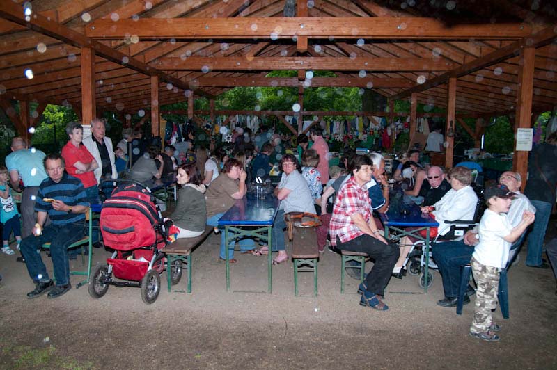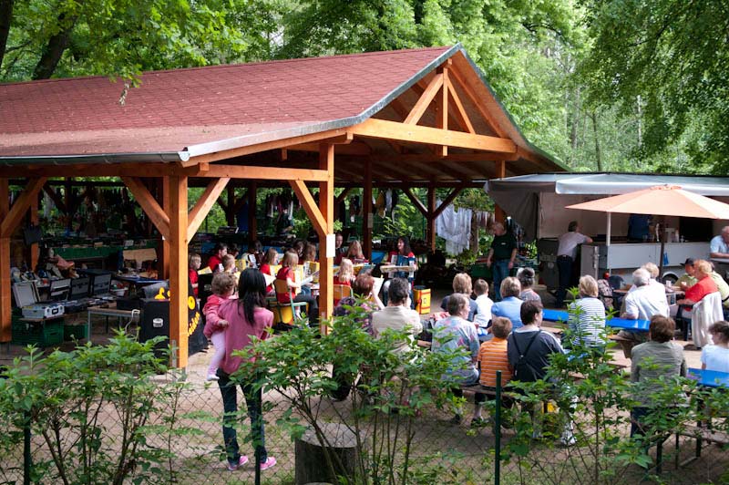 Pünktlich zum Frühlingsfest am 14. Mai konnte das 12 mal 12 Meter große Freiflächendach im Eingangsbereich fertig gestellt werden. Es bot zahlreichen Besuchern Schutz, als Petrus am späteren Nachmittag seine ganz persönliche Einweihung vornahm. Für das riesige Holzdach hat der Tierparkverein eine ungewöhnliche Finanzierung wählen müssen. Stefan Teuber: "Wir waren uns immer einig, dass so ein Dach sinnvoll ist. Doch 2011 hätten wir es neben dem Bau der Außenanlage für die Hutaffen eigentlich nicht stemmen können. Vereinsmitglieder haben uns aber die 20 000 Euro zinsfrei vorgestreckt." So spart der Tierpark schon ab diesem Jahr die Festzeltmiete zu Weihnachten.