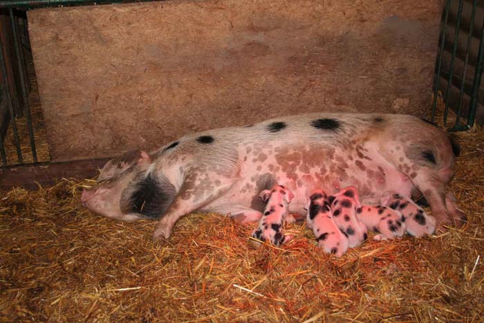Im zweiten Anlauf hat es nun geklappt: Unsere beiden Sauen der selten gezeigten Rasse "Buntes Bentheimer Schwein" haben geferkelt. Die eine Sau hat 6 Junge, die andere 5.