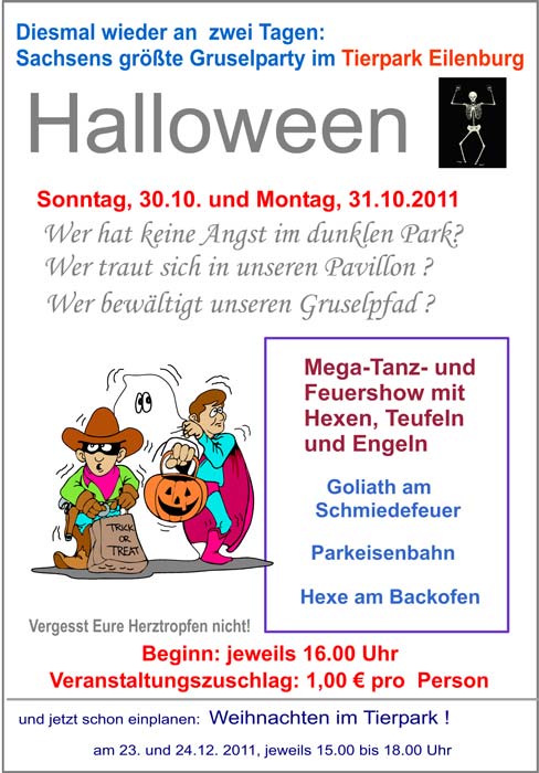 Das zweitägige Halloweenfest 2011 hat sich als der Besuchermagnet schlechthin erwiesen. Mit 4500 Gästen feierten so viele wie noch nie in dem mit Hunderten Kerzen, Fackeln und Kürbissen geschmückten Tierpark. Ganz nebenbei stellte der Tierpark einen neuen Tagesrekord auf. Denn noch nie zuvor haben diesen in seiner über 50-jährigen Geschichte mehr als 3000 Besucher an einem Tag besucht. Am Sonntag wurde dies mit 3100 Gästen geschafft. Gespenster und Skelette grüßten diese von Imbiss und Gruselpfad, ein Sensenmann ruderte auf dem kleinen Schwanenteich an ihnen vorbei. Ein Schmied hatte sein eigenes heißes Eisen im Feuer. Höhepunkt des zweitägigen Festes war zum zweiten Mal die zweistündige Show der Eilenburger Tanzgruppen auf der Pferdekoppel. Von 17 bis 19 Uhr lieferten rund 100 Hexen, Feuerflammen, Wassernixen, Feuerteufel, Fackelträger und Mr. Fireman eine Show der Extraklasse. Der Tierparkverein, von dem selbst Dutzende Helfer an Knüppelkuchen- und Glühweinständen, als Feueranzünder, Toilettenaufsicht, Holz- und Verpflegungstransporter, am Backofen und als Gespenster und Hexen vom Dienst oder an der Kasse im Einsatz waren, hätten diesen Großeinsatz aber nicht ohne weitere Unterstützung stemmen können. Der Dank geht daher auch an dieser Stelle an den Burgverein, der seine Bühne zur Verfügung stellte, das DRK, das zum Glück keine Herztropfen verteilen musste sowie an das Technische Hilfswerk, das auf den Parkflächen ordnend wirkte. Auf ein Wiedersehen zu Halloween 2012.