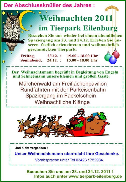 Weihnachten im Tierpark hat eine langjährige Tradition und ist die festlichste Veranstaltung des Jahres. Wir laden zu einem weihnachtlichen Spaziergang durch unsere liebevoll geschmückte Anlage ein, die bei einbrechender Dunkelheit mit Fackeln und Lichterketten beleuchtet ist. So kann man den Tierpark von einer ganz anderen und besonders reizvollen Seite erleben. Durchs Gelände tuckert wie immer die Parkeisenbahn, die übrigens nicht nur von den Kindern genutzt wird. Weihnachtliche Klänge sind diesmal aus dem neu errichteten Freiflächenpavillon zu hören, wo auch unser Weihnachtsmann die Geschenke übereicht. Diese werden von den Eltern mitgebracht oder schon vorher im Tierpark abgegeben. Das Freiflächengelände wird mit dutzenden Weihnachtsbäumen zu einem kleinen Märchenwald gestaltet, den man durchlaufen kann.Wir laden ein zum gemeinsamen Singen, zum Backen von Knüppelkuchen, am 23.12. auch zur Anfertigung hübscher Weihnachtsdekoration. Und was wäre Weihnachten ohne Zuckerwatte, Glühwein und Bratenduft. Die gastronomische Versorgung an mehreren Ständen wird durch unsere Gaststätte wieder bestens gewährleistet.