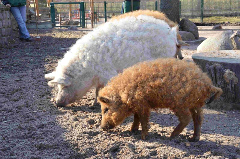 Gestatten, ich bin Alf, der neue Eber im Wollschweingehege. Ich komme aus Thüringen und bin gerade mal drei Monate alt. Später soll ich dafür sorgen, dass immer genügend kleine Streichelschweinchen für die Besucherkinder da sind. Noch bin ich neben meinen drei Mädels zum Eingewöhnen untergebracht. Mann, sind die schön! Und groß! Und knuffig! Sie werden von den Tierpflegern sogar gekämmt! Ich muss sie Euch demnächst unbedingt mal zeigen. Aber jetzt wird wieder gefressen. Schließlich will ich ganz schnell so groß werden wie meine drei Bräute in spe.