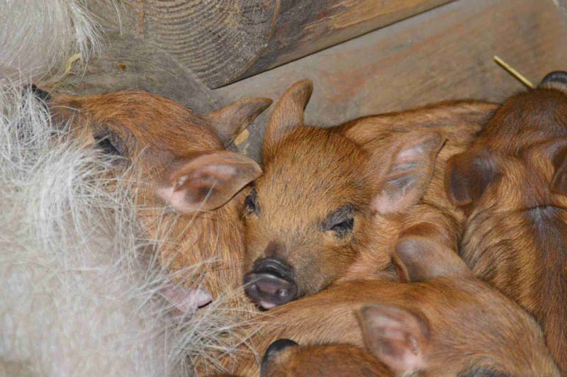 Wie immer die freudige Nachricht angekündigt wird: Es gibt die ersten Wollschweinferkel im Eilenburger Tierpark. Und bald rappelt's gewaltig weiter in der Kiste. Unsere beiden anderen Sauen dieser WG dürften nicht mehr lange mit ihrem Nachwuchs auf sich warten lassen. Dabei hatten wir erst im Frühjahr damit gerechnet. So agil wie die Kleinen schon sind, werden sie sich in Kürze draußen sehen lassen. Dann dauert es nicht mehr lange, und wir können sie zu den Kindern auf die benachbarte Spielfläche lassen. Darauf freuen wir uns schon lange. Streichelschweine sind nämlich was ganz besonderes. Das muss man ausprobiert haben! Unsere Ferkel sind braun und haben ein leichtes Streifenmuster. Ihre Mutter dagegen hat den Farbschlag "blond", wie es offiziell heißt. Die beiden anderen Sauen sind " rot". Mal sehen, wie der nächste Wurf farblich dann ausfällt. Unserem roten Alf dürfte das ziemlich Wurst sein. Er ist jetzt Vater und das allein zählt. Wer mehr über diese inzwischen seltene Schweinerasse wissen möchten, kann in den diversen Kanälen gerne unter Mangalitza-Schwein nachsehen. Es ist eine alte Schweinerasse aus Ungarn, deren Fleisch übrigens in der gehobenen Gastronomie auf der Karte steht und von Kennern geschätzt wird.
