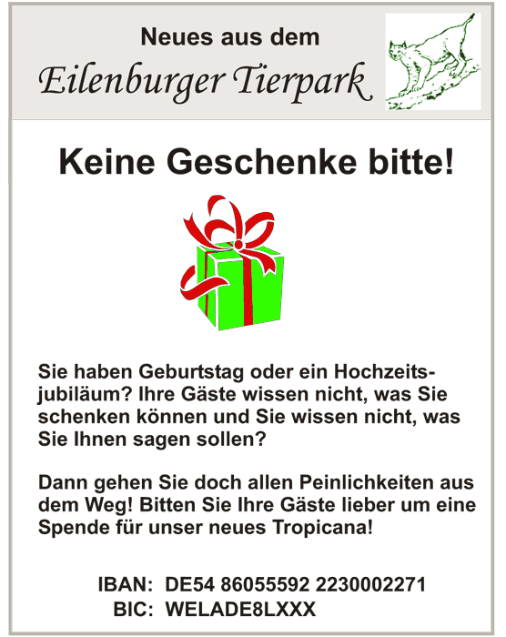 Zum traditionellen Osterfest startete der Eilenburger Tierparkverein neben Altbewährtem wie begrüßender Osterhase, Parkeisenbahn, tanzenden Hasen und Hüpfburg mit einer Premiere. Erstmals wurden Handzettel verteilt, mit denen der Tierparkverein seine Sammelaktion für ein konkretes Projekt, dem Ersatzneubau für das in diesen Tagen schließende Tropicana, startet. Informiert werden die Besucher darüber, dass sich ein Neubau an gleicher Stelle bautechnisch (ständige Feuchtigkeit), wirtschaftlich und aus grünpflanzerischen Belangen nicht wirklich anbietet. Da das 2001 eröffnete Tropicana aber dennoch ein sehr beleibter Bestandteil der Einrichtung ist, möchte der Tierparkverein es nun an anderer Stelle neu errichten. Allerdings kostet dies nicht nur Zeit (Planung 2015, Baubeginn frühestens 2016) sondern vor allem Geld. Dabei setzt der Minizoo auch auf die Spendenbereitschaft seiner Besucher. Neben Überweisungen auf das unten stehende Konto sind auch Kleinstspenden am Spendentrichter oder an der Spendenkasse am Eingang möglich.