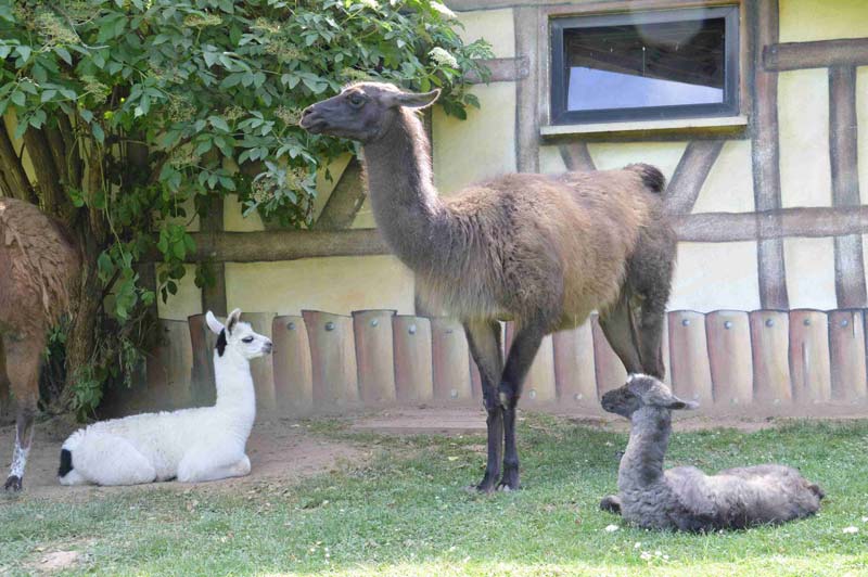 Jetzt ist die Familie komplett. Gestern Mittag (Mittwoch) wurde unser zweites Lama in diesem Jahr geboren. Es ist dunkel und hat einen hellen Fleck an Kopf. Das erste ist zwei Wochen älter, schneeweiß mit schwarzem Fleck am Kopf. Volltreffer, Oskar! Jedes seiner inzwischen sechs Kinder sieht anders aus.