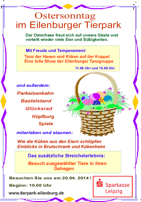 "Wir sehen uns bei jedem Wetter als eine Ganzjahreseinrichtung", gibt der Tierparkchef seit Langem die Richtung vor. Investitionen in Gaststätte, aber auch ins Haustierhaus und Warmhaus Tropicana sind Meilensteine auf dem Weg dahin. Zu entdecken gibt es für die vielen treuen Besucher, die im Übrigen für eine Jahreskarte nach wie vor nur 15 Euro bezahlen, auch in diesem Frühjahr genug. So meckern jetzt unter anderem vier kleine Zicklein, alles wahre schwarze Teufel, im Gehege. Und der erste Höhepunkt des Veranstaltungsjahres steht in den Startlöchern: Ostersonntag im Eilenburger Tierpark. Klicken Sie auf das Plakat für eine größere Darstellung.