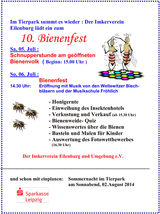 Einem der fleißigsten Lebewesen unseres Planeten widmen Imkerverein und Tierpark wieder ein eigenes Fest: der Honigbiene. Ob es dabei auch Bienenstich im Rahmen der Verkostung geben wird, sei mal dahingestellt. Die "richtigen" Bienenstiche werden wohl ausbleiben. Jedenfalls haben sich unsere Bienen bis jetzt gegenüber den Besuchern friedlich verhalten. Mehrere Bienenvölker haben reichlich Honig zusammengetragen, damit die Verkostung am Sonntag, dem 6. Juli, ein großer Erfolg wird. Unsere Gäste erfahren aus erster Hand von den Imkern des Eilenburger Vereins viel Wissenswertes und können selbstverständlich Honigprodukte erwerben. Das kleine Rahmenprogramm mit Musik, Quiz und Einweihung des Insektenhotels kann auch dem Plakat entnommen werden. Schon am Vortag können ab 15.00 Uhr die besonders Neugierigen während der "Schnupperstunde am Bienenvolk" dem Imker über die Schulter schauen.