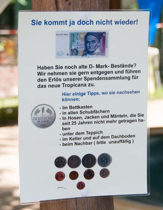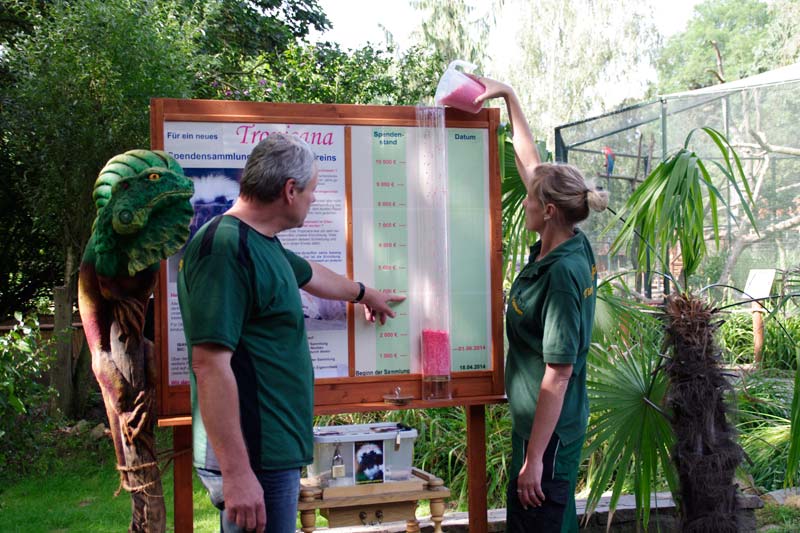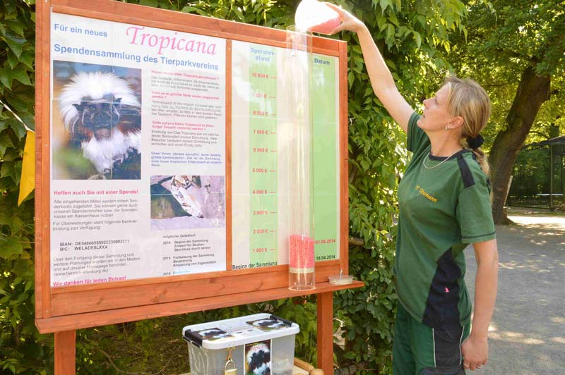 Seit Beginn der Spendensammlung für das neue Tropicana am 18. April sind schon mehr als 1300 Euro eingegangen. Ein schöner Anfangserfolg. Es handelt sich dabei vor allem um Kleinspenden der Tierparkbesucher. Kollegin Tessmann befüllt mit farbigem Granulat erstmals die Röhre, die den Spendenstand anzeigt. Tafel und Spendenkasse haben nunmehr einen ständigen Platz im Tierpark, um die Besucher zu informieren. In diesem und auch im nächsten Jahr wird gesammelt und geplant. Wann Baubeginn ist, hängt nicht unwesentlich von den eingehenden Spenden ab. Nicht nur die Besucher sollen angesprochen werden, sondern auch die Firmen in der Region. Über den Verlauf der Aktion werden wir regelmäßig berichten.