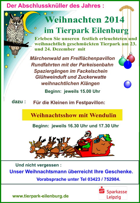 Ein ereignisreiches Jahr geht zu Ende und wir laden wieder zum weihnachtlichen Spaziergang durch unsere liebevoll geschmückte Anlage ein, die bei einbrechender Dunkelheit stimmungsvoll beleuchtet ist. So kann man den Tierpark am 23. und 24.12. ab 15.00 Uhr von einer besonders reizvollen Seite erleben. Es ist zwar nicht die größte, aber die festlichste Veranstaltung eines jeden Jahres. Weihnachtliche Klänge, Bratenduft, Zuckerwatte und Glühwein gehören so selbstverständlich dazu wie unser Weihnachtsmann, der auf Wunsch Ihre Geschenke überreicht. Diese werden von den Eltern mitgebracht oder schon vorher im Tierpark abgegeben. Aber auch Elch und Grinch sind wieder dabei. Durchs Gelände tuckert wie immer unsere Parkeisenbahn, die nicht nur von den Kindern gerne genutzt wird. Das Freiflächengelände ist mit Weihnachtsbäumen zu einem kleinen Märchenwald geworden, den man durchlaufen kann. Dort befindet sich auch der Knüppelkuchenstand. Wer noch schnell etwas Dekoratives basteln will, ist bei Frau Küas im Holzhaus herzlich willkommen. An beiden Tagen gibt es im Pavillon, wo man auf Strohballen Platz nehmen kann, die Kinder-Unterhaltungsshow mit unseren Weihnachtsgast, dem Wendulin (jeweils16.30 Uhr und 17.30 Uhr).
