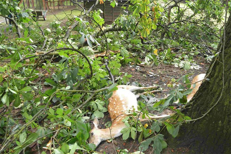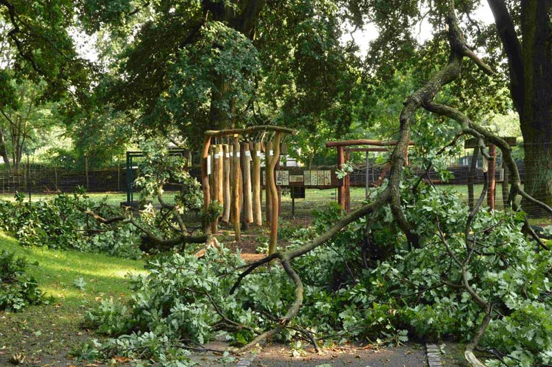 zeigte sich beim ersten Rundgang nach diesem Orkan am späten Nachmittag des 18. Juli. Dass es niemanden erschlagen hat, grenzt an ein Wunder. Ganze Bäume sind entwurzelt, Wege und Gehege mit herunter gebrochenen Ästen übersät. Ein Baum liegt auf dem Aussichtsturm am Affengehege, ein anderer auf dem Dach des Haustierpavillons. Aber unsere Tiere sind diesmal mit dem Schrecken davon gekommen. Unser Personal und einige Helfer haben sofort mit den Aufräumarbeiten begonnen. Man kann sich eben auf die Truppe verlassen. Auch die Feuerwehr kam schnell und half beim Beseitigen großer gebrochener Äste, die in den Bäumen hingen.