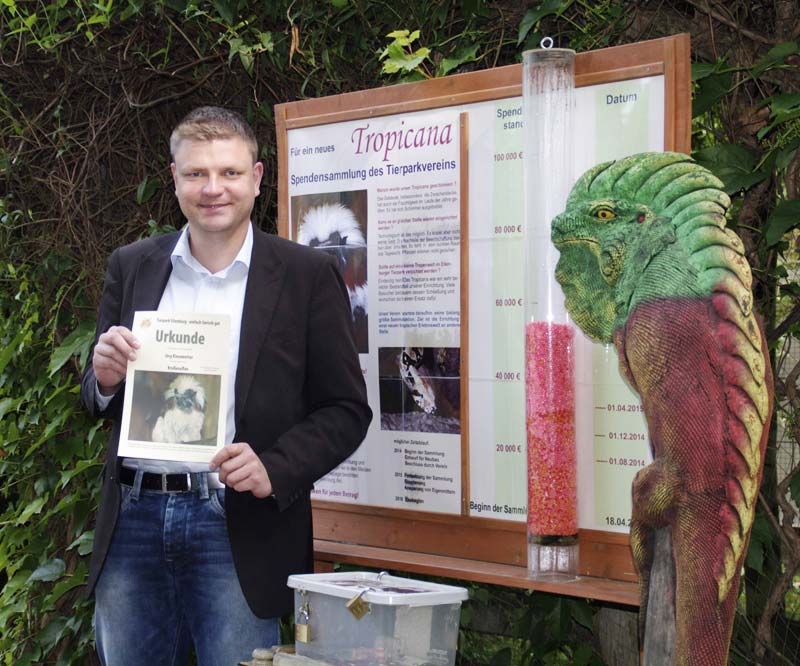 Ermutigende 56 000 Euro sind bisher an Spendengeldern für das neue Tropicana zusammengekommen. Dennoch muss der Tierparkverein weiter sammeln. Ab sofort kann man daher auch als Pate von Krallenaffe oder Leguan den Neubau des Tropicanas unterstützen. Die Patenschaften kosten 100 beziehungsweise 50 Euro und gelten für ein Jahr, können aber natürlich auch danach fortgeführt werden. Als Erster griff der CDU-Landtagsabgeordneter Jörg Kiesewetter diese Idee auf und wurde Krallenaffenpate. "Affen gelten als praktisch, hilfsbereit, herzlich und aktiv. Vor allem wird ihnen aber nachgesagt, dass ihnen nie die Ideen ausgehen. Gerade Letzteres finde ich auch am Eilenburger Tierpark gut", erläuterte Jörg Kiesewetter, der diesen übrigens gern in Familie samt vierjähriger Tochter Ella besucht. Für den Tierparkverein ist der Neubau, trotz bereits bisher gestemmter Großprojekte wie Haupthaussanierung und Gaststättenbau die bisher größte Herausforderung. Obwohl die Erschließung für den Bau neben der Hutaffenanlage und direkt am Außenzaun bereits vorhanden ist, rechnet der Tierparkverein mit Gesamtkosten in Höhe von rund 300 000 Euro. Trotz einer möglichen Kreditaufnahme heißt es daher für den Tierparkverein weiter sammeln und möglichst viele Tierpaten gewinnen.