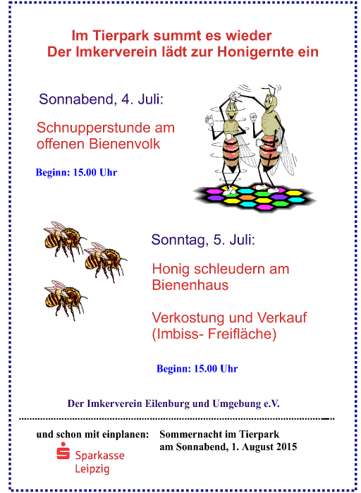 Mit den vorhergesagten hochsommerlichen Temperaturen kommen unsere Bienen Ende Juni noch richtig in Fahrt, um den Honig für unsere Ernte am 5. Juli zu sammeln. Dann heißt es wieder: Kosten und kaufen. Frisch geschleuderter Tierparkhonig kommt auf die Tische am Imbiss. Und wer sich darüber hinaus für dessen Entstehung und Gewinnung interessiert, ist schon am Vortag recht herzlich zur Schnupperstunde am Bienenstock eingeladen. Die Imker vom Eilenburger Verein geben dort fachliche Auskunft. Eine kleine und etwas spezielle Veranstaltung, die aber auch ihre Reize hat (Beginn: jeweils 15.00 Uhr ). Unser Neuer Bienenbär jedenfalls freut sich schon auf die Besucher.