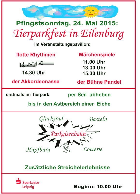 Klicken Sie auf die Bilder, um sich die Ankündigungsplakate in Groß anzuschauen. Pfingstsonntag und am darauffolgenden Sonntag wird im Tierpark wieder jede Menge geboten.