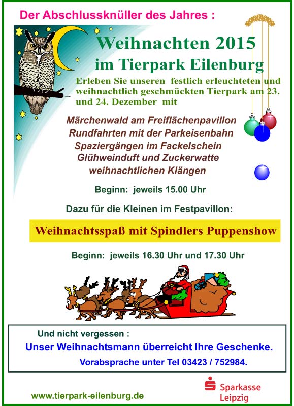 Ein ereignisreiches Jahr geht zu Ende und wir laden wieder zum weihnachtlichen Spaziergang durch unsere liebevoll geschmückte Anlage ein, die bei einbrechender Dunkelheit stimmungsvoll beleuchtet ist. So kann man den Tierpark am 23. und 24.12. ab 15.00 Uhr von einer besonders reizvollen Seite erleben. Es ist zwar nicht die größte, aber die festlichste Veranstaltung eines jeden Jahres. Weihnachtliche Klänge, Bratenduft, Zuckerwatte und Glühwein gehören so selbstverständlich dazu wie unser Weihnachtsmann, der auf Wunsch Ihre Geschenke überreicht. Diese werden von den Eltern mitgebracht oder schon vorher im Tierpark abgegeben. Aber auch Elch, Grinch und Eisprinzessin sind wieder dabei. Durchs Gelände tuckert wie immer unsere Parkeisenbahn, die nicht nur von den Kindern gerne genutzt wird. Das Freiflächengelände ist mit Weihnachtsbäumen zum kleinen Märchenwald geworden, den man durchlaufen kann. Dort befindet sich auch der Knüppelkuchenstand. Wer noch schnell etwas Dekoratives basteln will, ist bei Frau Küas im Holzhaus herzlich willkommen. An beiden Tagen gibt es im Pavillon, wo man auf Strohballen Platz nehmen kann, Weihnachtsspaß mit Spindlers Puppenshow (jeweils 16.30 Uhr und 17.30 Uhr).