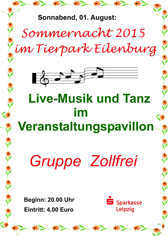 Es ist eine unserer kleinen Veranstaltungen, aber die Besucher wollen sie einfach nicht missen: die Sommernacht im Tierpark. Und es ist die Fünfte, also sogar noch ein kleines Jubiläum. Grund genug, wieder einmal Live-Musik anzubieten, diesmal mit der Gruppe "Zollfrei" aus Eilenburg. Wird es wieder eine tropische Nacht, wie es die bunte Dekoration verheißt? Oder muss die Tanzfläche intensiv zur Erwärmung genutzt werden? Egal - wir sind auf jedes Wetter vorbereitet.